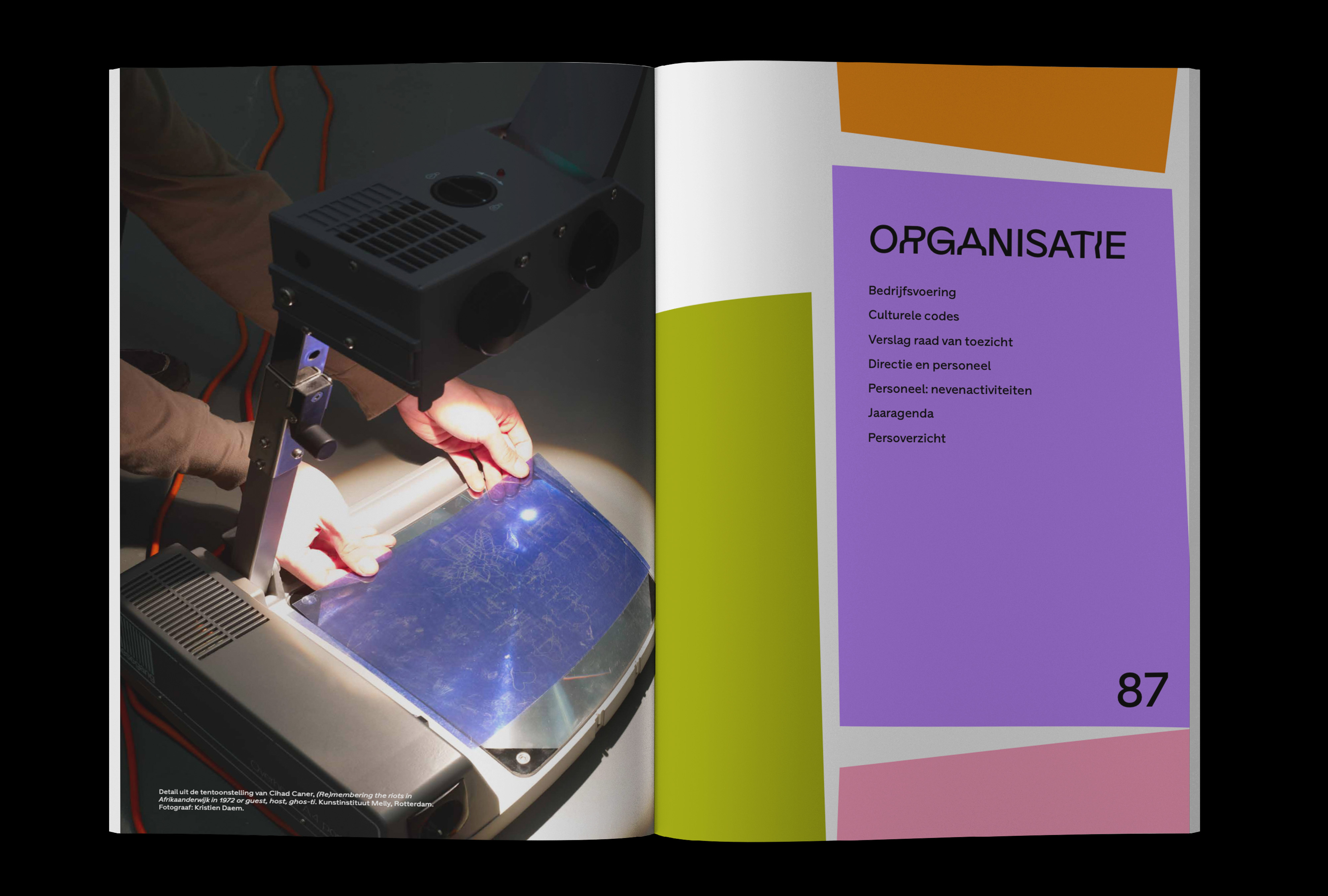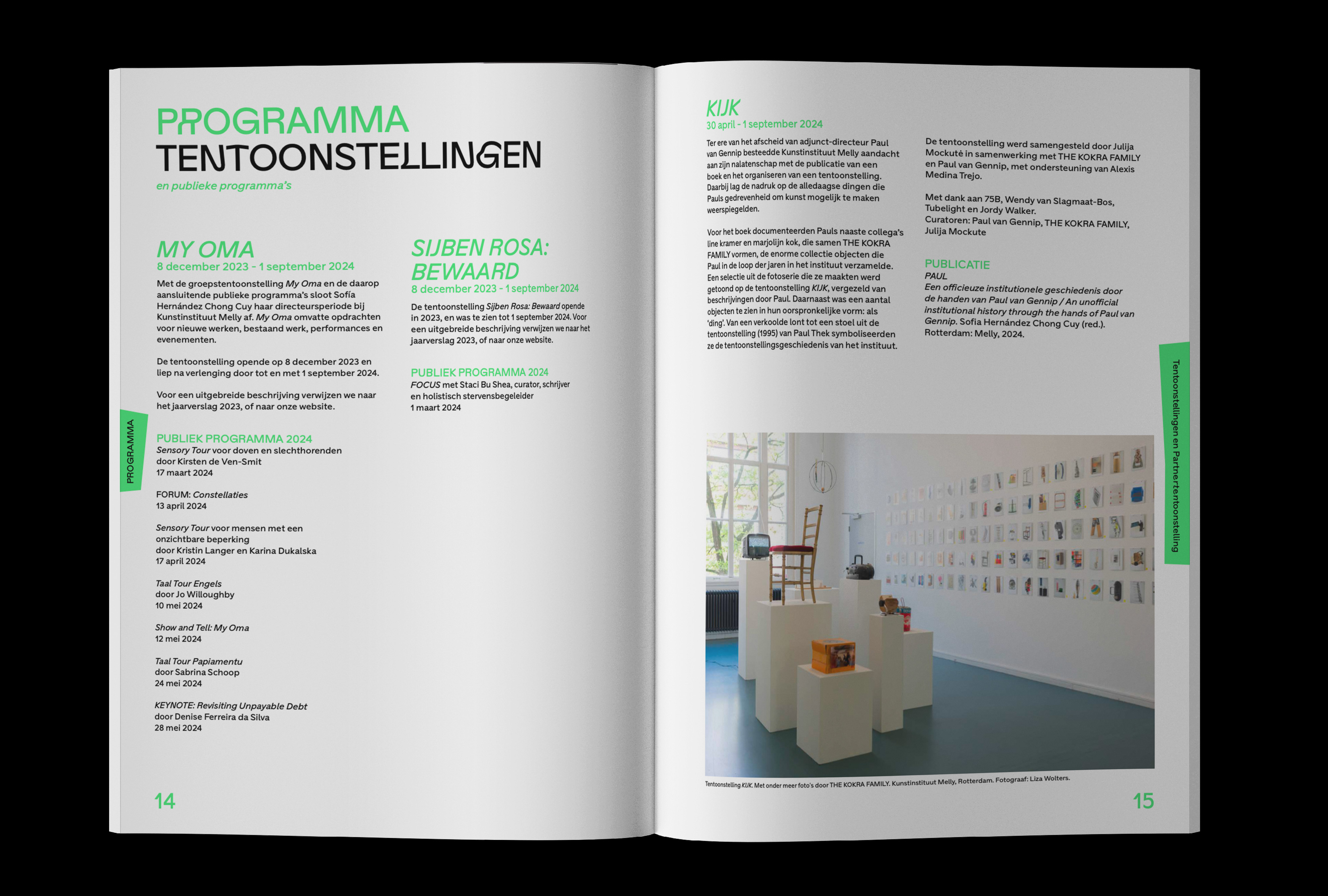 Kuninstituut Melly is a contemporary art house located in a former school building on Witte de Withstraat, in Rotterdam, the Netherlands. It is a center for contemporary art with a mission of curating and exhibiting international art exhibitions. Kuninstituut Melly approached studio 75B with an assignment of designing their 2024 Annual Report.